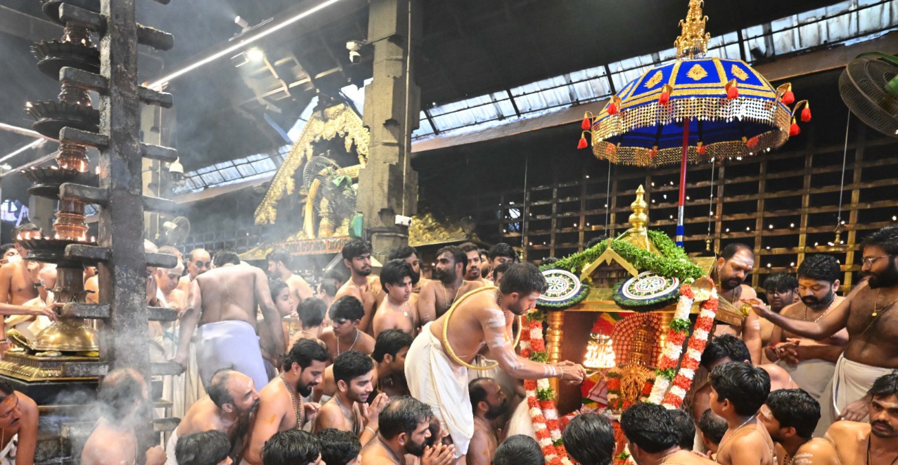 വൈകീട്ടത്തെ ദീപാരാധനക്ക് ശേഷം അഞ്ചാനകളോടേയുള്ള എഴുന്നെള്ളിപ്പോടെയാണ് തന്റെ പ്രജകളെ കാണാനായി ഭഗവാൻ ഗ്രാമപ്രദക്ഷിണത്തിനായി ക്ഷേത്ര മതില്കെട്ടിന് പുറത്തിറങ്ങിയത്. സ്വര്ണ്ണക്കോലത്തില് വെള്ളിപൊതിഞ്ഞ പീഠത്തിലെ തങ്കവിഗ്രഹം, അസ്തമനസൂര്യന്റെ പൊന്കിരണത്താല് പ്രഭാപൂരിതമായപ്പോള്, ഭക്തജനസഹസ്രം ആത്മനിര്വൃതിയില് ഭഗവാനെ എതിരേറ്റു. പള്ളി വേട്ട ദിനത്തിലും ആറാട്ട് ദിവസവും ക്ഷേത്രം കൊടിമരത്തറക്ക് സമീപമാണ് ഭഗവാന് ദീപാരാധന. സ്വര്ണ്ണപഴുക്കാമണ്ഡപത്തിലെഴുെന്നള്ളിയ ഭഗവാനെ ഈ രണ്ടുദിവസങ്ങളിലും ക്ഷേത്രത്തില് ശാന്തിയേറ്റ കീഴ്ശാന്തിമാരാണ് ദീപാരാധന നടത്തുക. ഇന്ന് നടന്ന ദീപാരാധന, ശാന്തിയേറ്റ കീഴ്ശാന്തി നാകേരി ഹരിനമ്പൂതിരി നിര്വ്വഹിച്ചു.