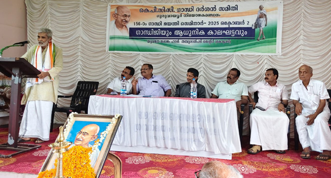 ഗുരുവായൂർ : ഗാന്ധിദർശൻ ഗുരുവായൂർ നിയോജകമണ്ഡലം കമ്മിറ്റിയുടെ ആഭിമുഖ്യത്തിൽ ഗാന്ധി ജയന്തി ദിനത്തോടനുബന്ധിച്ച് തമ്പുരാൻപടി യുവജന സമാജം ഹാളിൽ വെച്ച് ഗാന്ധിജിയും ആധുനിക കാലഘട്ടവും വിഷയത്തെക്കുറിച്ച് സെമിനാർ സംഘടിപ്പിച്ചു. സാഹിത്യകാരനും വിദ്യാഭ്യാസ ചിന്തകനുമായ ബഷീർ കെ. സുജിവനം സെമിനാർ ഉദ്ഘാടനം ചെയ്തു നിയോജകമണ്ഡലം പ്രസിഡൻറ് പി.സി.തോമസ് അധ്യക്ഷതവഹിച്ചു.. മാധ്യമപ്രവർത്തകൻ കെ.സി. ശിവദാസ് മുഖ്യപ്രഭാഷണം നടത്തി.