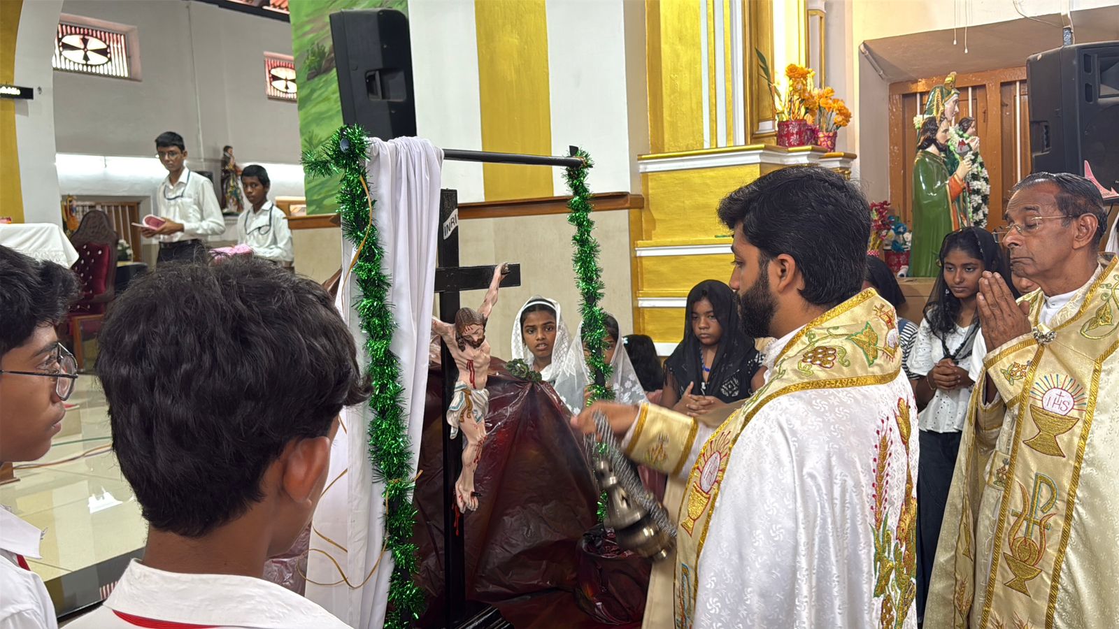 രാവിലെ 7 മണിക്ക് ആരംഭിച്ച തിരുക്കർമ്മങ്ങളിൽ ദുഃഖവെള്ളി തിരുക്കർമങ്ങൾക്ക് അസി. വികാരി ഫാ. നിതിൻ താഴത്ത് മുഖ്യ കാർമികത്വം വഹിച്ചു. ഫാ അഗസ്റ്റിൻ കുളപ്പുറം വചന സന്ദേശം നൽകി.ആർച്ച്പ്രീസ്റ്റ് . ഡോ. ഡേവിസ് കണ്ണമ്പുഴ സഹ കാർമികത്വം നൽകി.തുടർന്ന് വിവിധ ഭക്ത സംഘടനകൾ കുടുംബ കൂട്ടായ്മകൾ എന്നിവ നേതൃത്വത്തിൽ പുത്തൻപാന പാരായണം നടത്തപ്പെടും.