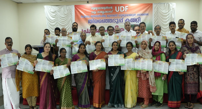 ഗുരുവായൂരിന്റെ നല്ല നാളെയ്ക്കുള്ള സമഗ്ര വികസനവും ജനക്ഷേമവും ലക്ഷ്യമാക്കി വികസിത പ്രയാണങ്ങൾ അടങ്ങിയ പൊതു സമൂഹവുമായി ചേർന്ന് തയ്യാറാക്കിയ സവിസ്തര പ്രകടന പത്രികയാണ്ആരവാവേശവുമായി പുറത്തിറക്കിയത്. ചടങ്ങിൽ വച്ച് യു ഡി എഫ്സ്ഥാ നാർത്ഥികളെ വി എം.സുധീരൻ സ്നേഹാർപ്പണവും നടത്തി.