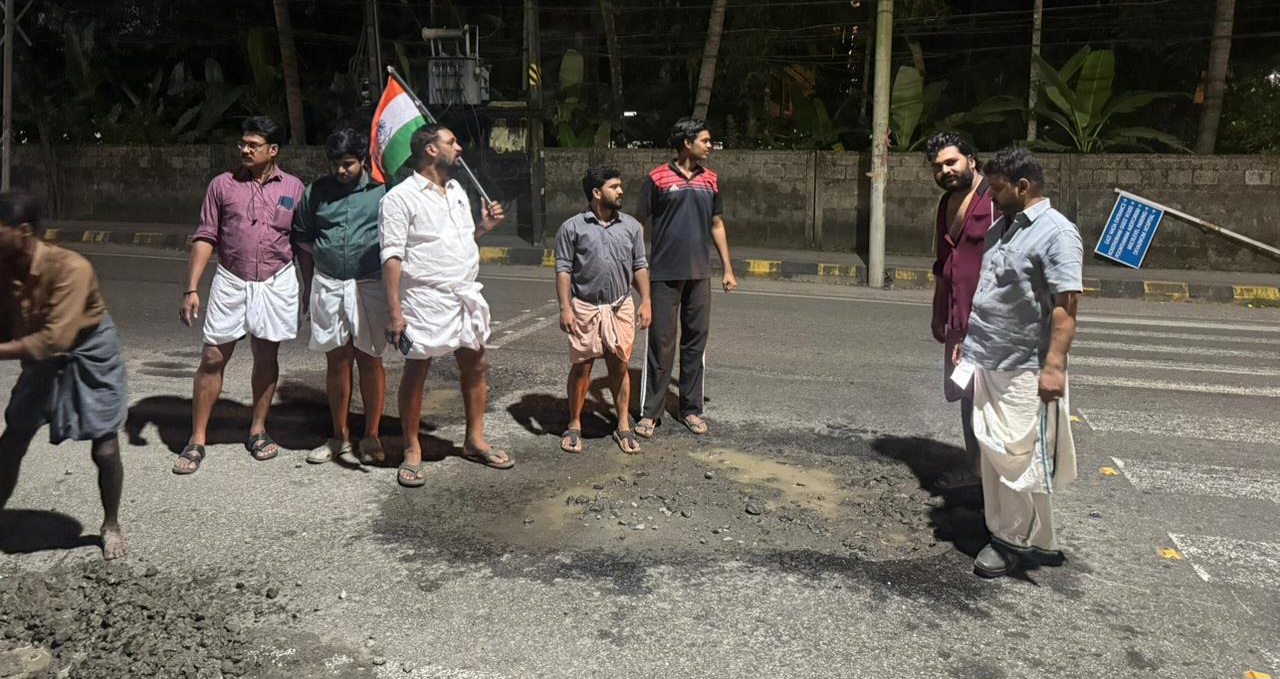 റോഡിലെ ഗർത്തം കോൺഗ്രസ് പ്രവർത്തകർ കോൺക്രീറ്റ് ചെയ്തു.