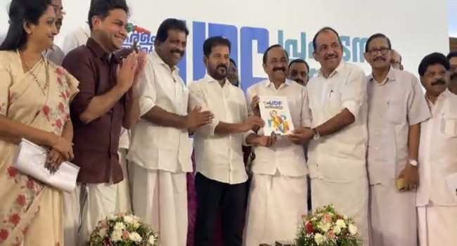 കൊച്ചി: നിയമസഭാ തെരഞ്ഞെടുപ്പില് യുഡിഎഫിന്റെ പ്രകടന പത്രിക തെലങ്കാന മുഖ്യമന്ത്രി രേവന്ത് റെഡ്ഡി പുറത്തിറക്കി. ‘കേരളം ജയിക്കും യുഡിഎഫ് നയിക്കും’ എന്ന മുദ്രാവാക്യം മുന്നോട്ടുവയ്ക്കുന്ന പ്രകടനപത്രികയില് സ്ത്രീകള്ക്ക് കെഎസ്ആര്ടിസി ബസുകളില് സൗജന്യ യാത്ര, കോളജ് വിദ്യാര്ഥിനികള്ക്ക് 1000 രൂപ പ്രതിമാസ ധനസഹായം, ക്ഷേമ പെന്ഷനുകള് 3000 രൂപയായി വര്ധിപ്പിക്കും, എല്ലാ കുടുംബങ്ങള്ക്കും 25 ലക്ഷം രൂപവരെ സൗജന്യ ഉമ്മന് ചാണ്ടി ആരോഗ്യ ഇന്ഷുറന്സ്, യുവജനങ്ങള്ക്ക് ബിസിനസ് ആരംഭിക്കുന്നതിന് പലിശ രഹിത വായ്പ 5 ലക്ഷം, മുതിര്ന്ന പൗരന്മാരുടെ ക്ഷേമത്തിനായി പ്രത്യേക വകുപ്പ് തുടങ്ങിയവയാണ് പ്രധാന വാഗ്ദാനങ്ങള്.